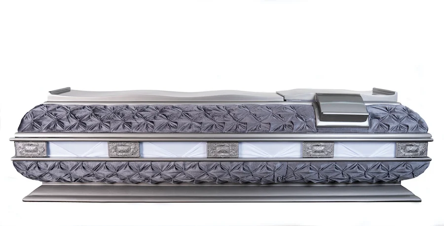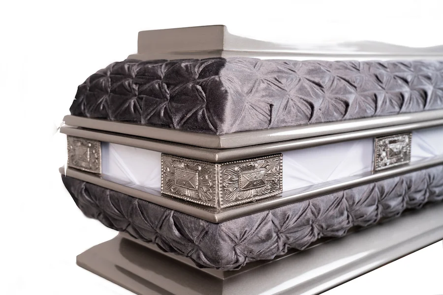 Cofre con apliques en tela de pana, disponible en colores color gris o vinotinto.