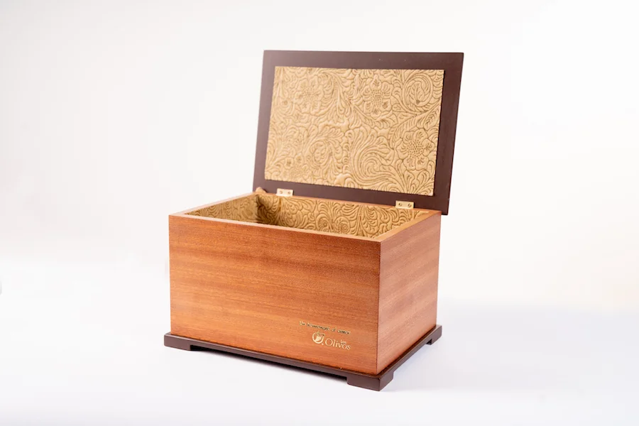 Urna de diseño conservador con un interior tapizado elegante que aporta clase y elegancia.